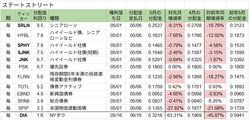 ステートストリート社ETFの権利落ちは債券ETFは1日、【DIA】は16日です。
