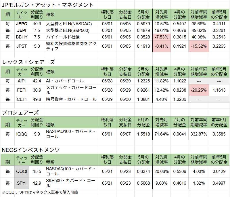 | 毎 | SPYI | 12.9 | S&P500・カバード・コール | 05/21 | 05/23 | N |