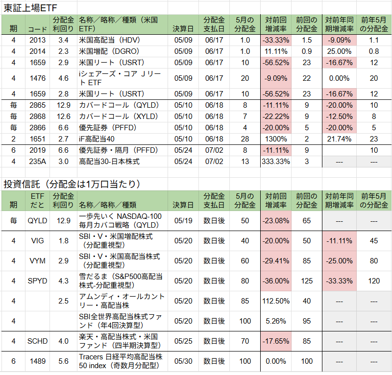 - 5月の主要ETFの分配金(配当金)スケジュール